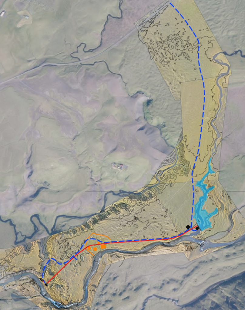 Yfirlitsmynd yfir allar framkvæmdir vegna Tunguvirkjunar. Vegur að inntaki og stöðvarhúsi er blá brotin lína, pípan er rauð lína, stöðvarhús, inntak, frárennslisskuður og fráleggssvæði eru svört, leifar af bænum Tungu ásamt túngarði er appelsínugult og inntakslón virkjunar er ljósblátt.